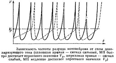 Получается, что нейрон при передаче сигналов «обедняет» информацию. Правда, оказывается, что хотя нейрон ничего не может сообщить об источниках входных сигналов, он может сообщить об их силе. Как это делается? Амплитуда входного сигнала — это сумма всех синаптических потенциалов, создаваемых активными синапсами. Пусть во время действия сигнала амплитуда его не меняется. Тогда через мембрану нейрона все время будет течь примерно постоянный синаптический ток. Легко сообразить, что чем больше ток, идущий через мембрану, тем с большей частотой будет работать нейрон. Действительно, после каждого очередного импульса мембрана нейрона гиперполяризуется, так как открываются калиевые каналы. Чем больше ток, текущий через мембрану нейрона тем быстрее он возвратит его потенциал к пороговому значению. Таким образом, чем больше амплитуда входного сигнала, тем выше частота выходных импульсов. Этот способ передачи информации называют частотным кодированием.