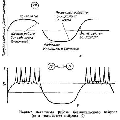 Мы видели, что для генерации ритмических движений при плавании в нервной системе пиявки имеется специальная схема из нейронов, которая генерирует периодические сигналы. Оказывается, источником периодических сигналов может быть и одиночный нейрон. Это еще один очень важный тип «нестандартных» нейронов, часто тоже безымпульсных. Эти нейроны способны сами по себе работать ритмически: потенциал такого нейрона все время колеблется, при деполяризации концевые веточки его аксона выделяют больше медиатора, и он возбуждает обычные импульсные нейроны, а при гиперполяризации выделение медиатора прекращается.