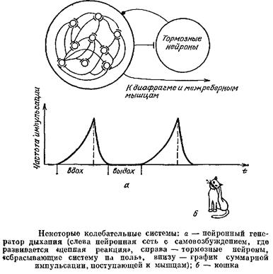 Когда некоторые нейроны этой сети возбуждаются, то в ней начинается цепная реакция, т. е. в последующие моменты времени возбуждается больше клеток, чем в предыдущий, и число импульсов в системе растет подобно тому, как растет число нейтронов в куске урана при ядерной цепной реакции. Кроме того, в сети имеются тормозные клетки с достаточно высоким порогом возбуждения и на них оканчиваются аксоны от возбуждающих нейронов сети. Когда уровень «цепной реакции» становится достаточно высоким, тормозные нейроны срабатывают и затормаживают возбуждающие нейроны, во всяком случае, большинство из них. Но от этого и сами тормозные нейроны замолкают, так как возбуждать их некому, и все начинается сначала. Во время развития цепной реакции происходит вдох, а в то время, когда она заторможена, — пассивный выдох.