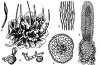 Рис. 9. Сфагнові мохи ( Sphagnum ): 1 — протонема з молодою рослиною; 2 — верхня частина моху зі спорогоном; 3 — архегоній; 4 — гілочка з антеридіями; 5 — антеридій; 6 — спорогон у розрізі; 7 — спорогон збоку