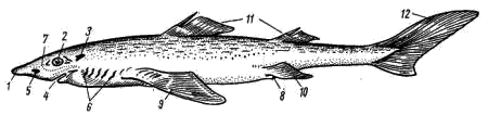 1 — рыло, 2 — глаз, 3 — брызгальце, 4 — рот, 5 — ноздря, 6 — жаберные щели, 7 — отверстия органа боковой линии, 8 — клоака, 9— грудной плавник, 10 — брюшной плавник, 11 — спинные плавники, 12 — хвостовой плавник