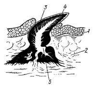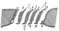 Дыхательная система. Глотка акулы пронизана пятью парами жаберных щелей, открывающихся наружу. В стенках глотки между жаберными щелями располагаются хрящевые жаберные дуги. К жаберным дугам прикрепляются кожистые межжаберные перегородки (рис. 5, 1 ), доходящие до наружного жаберного отверстия и прикрывающие лежащую позади жаберную щель. На каждой стороне межжаберной перегородки в ее основных двух третях располагаются многочисленные пластинчатые жаберные лепестки (рис. 5, 2 ). Каждая сторона межжаберной перегородки с жаберными лепестками называется полужаброй, а две полужабры, прикрепленные к одной жаберной дуге, составляют жабру. У колючей акулы имеется одна полужабра, расположенная на подъязычной дуге (Рис. 5, а ), и четыре целые жабры (рис. 5, б, в, г , д ) — на I—IV жаберных дугах; V жаберная дуга жабры не несет. Небольшая, так называемая ложная жабра расположена на нижней стороне кожистой складки, нависающей над брызгальцем.