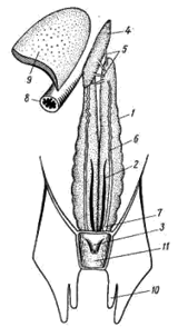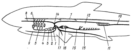 Пищеварительная система. Рот акулы снабжен подвижными хрящевыми челюстями. На коже, покрывающей челюсти, плакоидные чешуи преобразовались в крупные конические, загнутые вершинами назад зубы, которые располагаются несколькими рядами. На дне ротовой полости находится язык — небольшая складка слизистой оболочки, поддерживаемая непарным элементом подъязычной дуги; собственной мускулатуры он не имеет. Ротовая полость без заметной границы переходит в обширную глотку, пронизанную жаберными щелями. Выпадению пищи через жаберные щели препятствуют сидящие на жаберных дугах палочковидные хрящи — жаберные тычинки (рис. 5, 4 ). От задней части глотки начинается пищевод (oesophagus); на препарате он прикрыт печенью. Пищевод без заметных границ переходит в обширный, легко растяжимый U-образный желудок (gaster; рис. 3, 9 ). От желудка отходит короткая тонкая кишка (intestinum; рис. 3, 10 ), переходящая в значительно более широкую толстую кишку (colon; рис. 3, 11 ). За ней следует прямая кишка (rectum; рис. 3, 12 ), которая открывается в клоаку (рис. 3, 13 ). Внутри толстой кишки имеется просвечивающий сквозь ее стенки так называемый спиральный клапан; он представляет собой складку слизистой оболочки, которая вдается в просвет кишки. Складка расположена спирально; образует около десятка витков. Спиральный клапан значительно увеличивает всасывающую поверхность; его можно хорошо рассмотреть, сделав на участке толстой кишки продольный разрез. От средней части прямой кишки отходит полый пальцеобразный вырост — ректальная железа (glandula rectalis; рис. 3, 3 ) — орган солевого обмена. В период размножения ректальная железа выделяет пахучую слизь, которая в виде тонких нитей остается позади плывущей рыбы. Это облегчает встречу особей разного пола.
