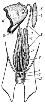 Самцы имеют парные семенники (testis; рис. 6, 4 ); они лежат в Виде удлиненных тел по бокам пищевода под лопастями печени (от наблюдателя). От семенников отходят тонкие семявыносящие канальцы (vasefferens; рис. 6, 5 ), видные как тонкие беловатые нити, проходящие по брыжейке, на которой подвешен семенник (пинцетом слегка оттянуть семенник). Семявыносящие канальцы впадают в верхнюю часть почки, фактически выполняющую функцию придатка семенника. Канальцы этой части почки сливаются в семяпровод — вольфов канал (vas deferens; рис. 6, 6 ); он проходит по средней линии брюшной поверхности почки. У половозрелых самцов самая концевая часть семяпровода образует расширение — семенной пузырек. Оба семяпровода (вольфовы каналы) открываются в полость вдающегося в клоаку мочеполового сосочка. К концу каждого вольфова канала примыкает, открываясь тоже в полость мочеполового сосочка, тонкостенный полый вырост — семенной мешок. Семенные мешки — остатки задней части мюллеровых каналов. Полость мочеполового сосочка открывается в клоаку расположенным на его вершине мочеполовым отверстием (рис. 6, 3 ).
