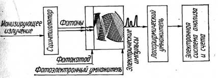 Основными компонентами любого сцинтилляционного счетчика являются сцинтиллятор, фотоумножитель, логарифмический усилитель электрических импульсов, электронная система анализа и регистрация (рис. 1).
