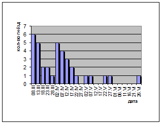 Первая вокализация около гнёзд отмечена 09.02.2008 г. В целом же гнездовой период был сильно растянут, находились свежие кладки в то время, как у некоторых пар птенцы уже покинули гнёзда. Первая кладка найдена 08.03.2008 г. Самый поздний выводок наблюдался в 20-х числах августа. Отмечена рекордная кладка (8 яиц) в искусственном гнездовье ящичного типа взамен утраченной (в первой кладке было 6 яиц). Из этого гнезда вылетело 7 птенцов. Динамика активности сов к началу гнездований характеризуется двумя пиками: первый пик приходится на период с 08.03 по 17.03, второй – с 02.04. по 11.04 (рисунок 4).
