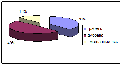 Анализ биотопического размещения гнездовий показал (рисунок 6), что серая неясыть предпочитает гнездиться в дубравах (49%), грабняках (38%) и смешанных лесах (13%).