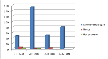 Рисунок 9 – Структура пищевого рациона сов (STRALU – серая неясыть, ASIOTU – ушастая сова, BUBBUB – филин, AEGFUN – мохноногий сыч)