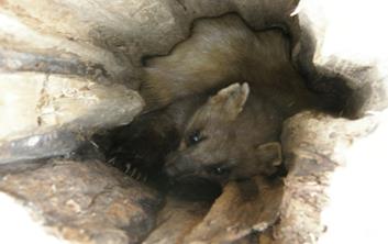 Рисунок 11 – Куница лесная с выводком в искусственном гнездовье для воробьиного сыча. Фото Абрамчука А.