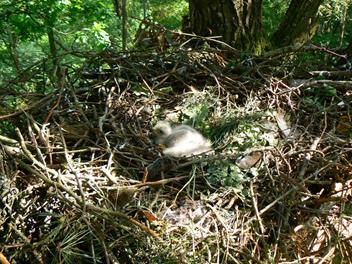Канюком обыкновенным были использованы две платформы, построенные нами для филина. В первом случае канюк выслал лоток свежими ветками, но приступать к размножению не стал. Во втором случае канюки заняли деревянную платформу недалеко от гнездового участка филина и успешно вывели птенцов (рисунок 12).