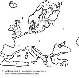 Рис. 2. Межледниковый период: 1 – хвойные леса; 2– широколиственные леса; 3 – жестколистные вечнозеленые леса