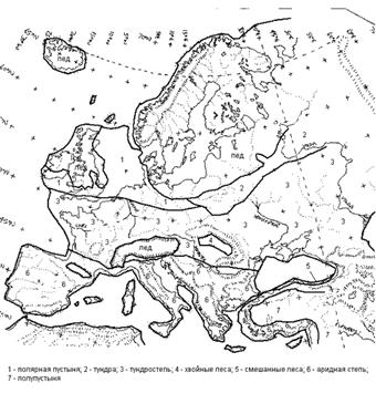 Рис. 3. Последнее оледенение: 1 – полярная пустыня; 2 – тундра; 3 – тундростепь; 4 – хвойные леса; 5 – смешанные леса; 6 – аридная степь; 7 – полупустыня