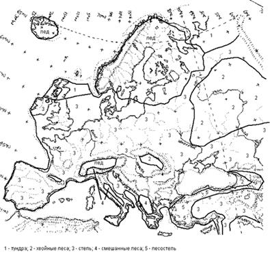 Рис. 4. Резкое потепление климата: 1 – тундра; 2 – хвойные леса; 3 – степь; 4 – смешанные леса; 5 – лесостепь