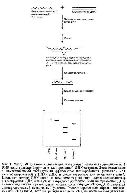 Единичные нуклеотндные замены во фрагментах геномной ДНК можно обнаружить при расщеплении неспаренных участков в РНК-ДНК-дуплексах, обрабатывая эти дуплексы РНКазой А. Рис. 1 иллюстрирует последовательные этапы процедуры.