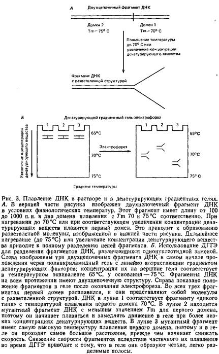 Разработанный Лерманом и Фишером метод электрофоретического разделения близких последовательностей ДНК основан на использовании различий в температуре плавления, обусловленных нуклеотидными заменами. Они исходят из того факта, что последовательность оснований влияет на Тт области плавления и что конформация фрагмента ДНК обусловливает его подвижность в геле под действием электрического поля. Принцип метода – электрофорез ДНК в акриламидном геле фиксированной концентрации с линейно возрастающим к нижней части геля градиентом концентрации веществ, денатурирующих ДНК: обычно мочевины или формамида. Электрофорезная камера нагревается до температуры примерно 60°С.