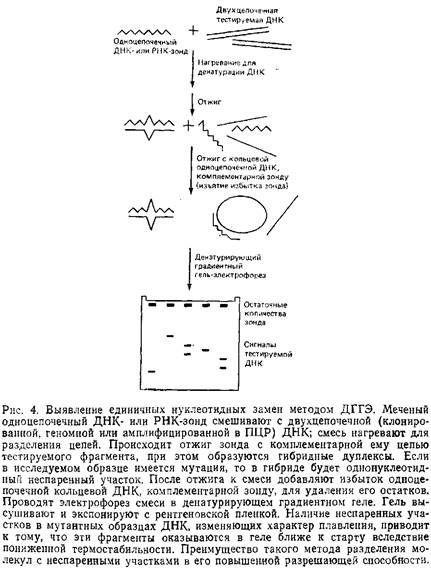 Приведенные здесь схемы ДГГЭ обеспечивают более высокую разрешающую способность и эффективность обнаружения мутаций за счет использования гетеродуплексов. Их основные этапы приведены на рис. 4. Исследуемые препараты ДНК отжигают с меченым одноцепочечным ДНК-зондом, и если в них произошла замена нуклеотида, образовавшийся гетеродуплекс будет иметь однонуклеотидный неспаренный участок. Далее проводят электрофорез в денатурирующем геле с последующей радиоавтографией, используя в качестве контроля гомодуплекс ДНК дикого типа. Таким образом, в этом случае не требуется стадии блотинга геля. Кроме одноцепочечных ДНК-зондов можно использовать асимметрично меченные двухцепочечные ДНК-зонды, а также меченые одноцепочечные РНК-зонды для тестирования ДНК в гибридах РНК–ДНК или РНК в РНК–РНК-гибридах.