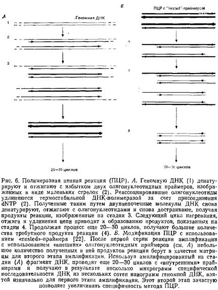 Если при амплификации геномной ДНК позвоночных в качестве праймеров для ПЦР используют олигонуклеотиды длиной 20 нуклеотидов и более, то процесс этот довольно специфичен и амплифицируется только один фрагмент ДНК – Однако иногда среди продуктов реакции наблюдается накопление фрагментов, происхождение которых трудно объяснить. А поскольку эти фрагменты могут мешать последующему анализу, то рекомендуется провести еще одну серию амплификации, с использованием другого набора олигонуклеотидных праймеров. Этот метод, именуемый «nestedoligo», состоит в следующем: продукт первичной полимеразной цепной реакции используется в качестве матрицы в последующих раундах ПЦР, но уже с двумя другими олигонуклеотидами, имеющими гомологии с участками ДНК внутри первичного амплифицированного фрагмента. Такая процедура позволяет получить большое количество индивидуальной последовательности ДНК, несколько более короткой, чем исходный фрагмент, и использовать ее для последующего анализа.