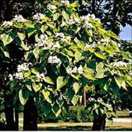 Япония и Китай. Листопадное дерево до 12 м высотой с широкой вееровидной кроной. Серая / серовато-коричневая в трещинах кора. Овальные зеленые цветки, до 17см длиной. Белые цветки, собраны в пониклые метелки.