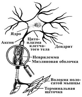Структурно-функциональной единицей нервной ткани являются нейроны или нейроциты. Под этим названием подразумевают нервные клетки (их тело — перикарион) с отростками, образуюшими нервные волокна (вместе с глией) и заканчивающимися нервными окончаниями. В настоящее время в широком смысле в понятие нейрон включают и окружающую его глию с сетью кровеносных капилляров, обслуживающих этот нейрон. В функциональном отношении нейроны классифицируют на 3 вида: рецепторные (афферентные или чувствительные), - генерирующие нервные импульсы; эффекторные(эфферентные) — побуждающие ткани рабочих органов к действию: и ассоциативные,образующие разнообразные связи между нейронами. Особенно много ассоциативных нейронов в нервной системе человека. Из них состоит большая часть полушарий головного мозга, спинной мозг и мозжечок. Подавляющее большинство чувствительных нейронов расположено в спинномозговых узлах. К эфферентным нейронам относятся двигательные нейроны (мотонейроны) передннх рогов спинного мозга, имеются также и особые неросекреторные нейроны (в ядрах гипоталамуса), вырабатывающие нейрогормоны. Последние поступают в кровь и спинномозговую жидкость и осуществляют взаимодействие нервной и гуморальной систем, т. е. осуществляют процесс их интеграции.