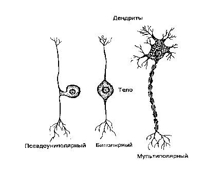 Характерной структурной особенностью нервных клеток является наличие у них двух видов отростков — аксона и дендритов. Аксон — единственный отросток нейрона, обычно тонкий, мало ветвящийся, отводящий импульс от тела нервной клетки (перикариона). Дендриты, напротив, приводят импульс к перикариону, это обычно более толстые и более ветвящиеся отростки. Количество дендритов у нейрона колеблется от одного до нескольких в зависимости от типа нейронов. По количеству отростков нейроциты подразделяются на несколько видов. Одноотростчатые нейроны, содержащие только аксон, называют униполярными(у человека они отсутствуют). Нейроны, имеющие 1 аксон и 1 дендрит, получили название биполярных.К ним относятся нервные клетки сетчатки глаза и спиральных ганглиев. И, наконец, имеются мультиполярные, многоотростчатые нейроны. Они имеют один аксон и два и более дендрита. Такие нейроны наиболее распространены в нервной системе человека. Разновидностью биполярных нейроцитов являются псевдоуниполярные (ложноодноотростчатые) чувствительные клетки спинномозговых и краниальных узлов. По данным электронной микроскопии аксон и дендрит этих клеток выходят сближенно, тесно примыкая друг к другу, из одного участка цитоплазмы нейрона. Это создает впечатление (при оптической микроскопии на импрегенированных препаратах) о наличии у таких клеток всего лишь одного отростка с последующим его Т-образным делением.