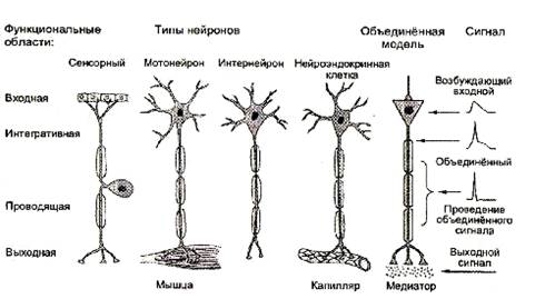 Таким образом, почти в каждом нейроне, независимо от его величины, формы и занимаемой в цепи нейронов позиции, можно обнаружить 4 функциональные области: локальную рецептивную зону, интегративную, зону проведения сигнала и выходную или секреторную зону.