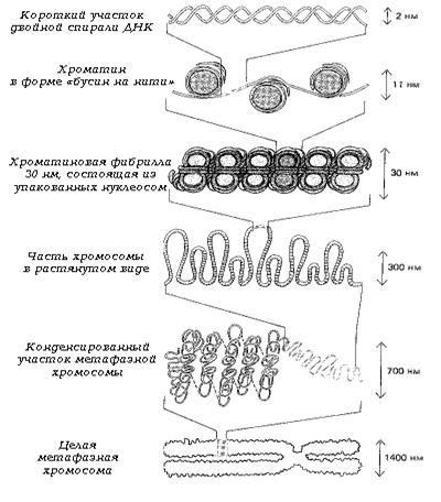 Как же помещаются в ядре такие длиннющие молекулы? Оказывается, в ядре существует механизм «насильственной» укладки ДНК в виде хроматина - уровни компактизации (рис. 1).