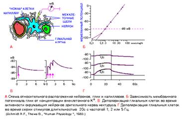 Глиальные клетки имеют высокую проницаемость для ионов калия. Когда несколько глиальных клеток деполяризуются вследствие местного повышения концентрации ионов калия, между деполяризованными и недеполяризованными клетками возникает ток, создающий вход ионам калия в деполяризованные глиальные клетки, в результате чего внеклеточная концентрация ионов калия уменьшается. Благодаря высокой проницаемости глиальных клеток для ионов калия и электрическим связям между ними глиальные клетки действуют как буфер в случае повышения внеклеточной концентрации калия. Данных об активном поглощении ионов калия путем ионного насоса в глиальных клетках нет, хотя, возможно, они активно поглощают нейромедиаторы в некоторых синапсах, ограничивая таким образом время действия медиатора.