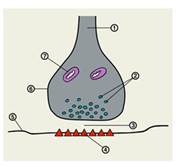 1 — нервное волокно (аксон); 2 — везикулы или синаптические пузырьки; 3 — синаптическая щель; 4 — рецепторы для медиатора; 5 — постсинаптическая мембрана; 6 —пресинаптическая мембрана; 7 — митохондрия.