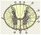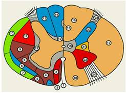 Слева обозначены проводящие пути, справа — участки серого вещества; одинаковыми цветами обозначены группы проводящих путей и соответствующие им участки серого вещества; синим цветом — чувствительные пути и задний рог, красным — пирамидные пути и передний рог, серым — собственные пучки спинного мозга и промежуточное вещество, зеленым — восходящие пути экстрапирамидной системы, желтым — боковой рог: 1 — покрышечно-спинномозговой путь; 2 — передний корково-спинномозговой путь; 3 — передний спиноталамический путь; 4 — преддверно-спинномозговой путь; 5 — оливоспинномозговой путь; 6 — ретикул-спинномозговой путь: 7 — передний спиномозжечковый путь; 8 — латеральный спиноталамический путь; 9 — красноядерно-спинномозговой путь; 10 — задний спиномозжечковый путь; 11 — латеральный корково-спинномозговой путь; 12 — собственные пучки спинного мозга; 13 — клиновидный пучок; 14 — тонкий пучок; 15 — овальный пучок; 16 — задний канатик; 17 — боковой канатик; 18 — передний канатик: 19 — промежуточное вещество; 20 — задний рог; 21 — боковой рог; 22 — передний рог; 23 — задний корешок; 24 — передний корешок.