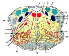1-четвертый желудочек; 2-дорсальное ядро блуждающего нерва; 3-ядро вестибулярною нерва; 4-ядро одиночного пути; 5-задний (дорсальный) спинно-мозжечковый путь; 6-спинномозговое ядро тройничною нерва; 7-спинно-мозговой путь тройничного нерва; 8-ядро подъязычного нерва; 9-оливное ядро; 10-олива; 11-корково-спинномозговой путь (пирамидный); 12-медиальная петля; 13-подъязычный нерв; 14-передние наружные дуговые волокна; 15-двойное ядро; 16-спинно-таламический и спинно-покрышечный пути; 17-блуждающий нерв; 18-вентральпый (передний) спинно-мозжечковый путь.