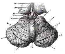 Мозжечок. Вид сверху. 1-червь мозжечка; 2-полушарие мозжечка; 3-щели (борозды) мозжечка; 4-листки мозжечка; 5-горизонтальная шель; 6-задняя вырезка мозжечка; 7-нижняя полулунная долька; 8-верхняя полулунная долька; 9-четырехугольная долька; 10-нижние холмики крыши среднего мозга; 11-верхний холмик; 12-эпифиз; 13-таламус; 14-третий желудочек.