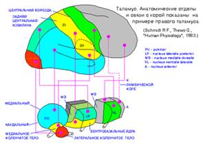 Таламус можно разделить на несколько функционально и/или анатомически различных ядер. Большая часть таламических ядер связана массивными трактами с областями коры головного мозга. Ядра таламуса можно разделить на четыре класса (см. рис. ниже) (упрощенно):
