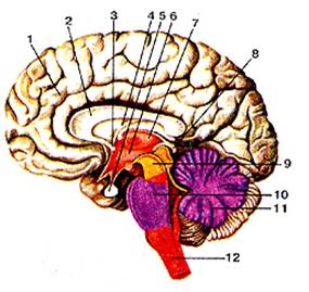 Головной мозг. Сагиттальный разрез. Вид с медиальной стороны.1-полушарие большого мозга; 2-мозолистое тело; 3-передняя (белая) спайка; 4-свод мозга; 5-гипофиз; 6-полость промежуточного мозга (III желудочек); 7-таламус; 8-эпифиз мозга; 9-средний мозг; 10-мост; 11 (-мозжечок; 12-продолговатый мозг.