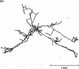 Рис. 1. Горизонтальные связи в зрительной коре. (А) Вид поверхности пирамидальной клетки зоны V1 кошки после введения пероксидазы хрена. Отростки простираются примерно на 3 мм вдоль поверхности коры. Тонкие веточки и синаптические бутоны данного нейрона обнаруживаются в нескольких отдельных кластерах, отдаленные друг от друга на расстояние 800 мм и более. (В) Микросферы с метками были введены в область, где клетки имеют предпочтение к вертикальной ориентации (помечено черным "X"). Микросферы захватываются терминалями аксона и транспортируются ретроградно в тела клеток, проецирующих свои отростки в область введения. Колонки вертикальной ориентации были также помечены, используя деоксиглюкозу, во время стимуляции глаза вертикально ориентированными полосками света. Микросферы с метками были обнаружены в зонах, помеченных деокси глюкозой, что говорит о наличии горизонтальных связей между клетками одной и той же ориентационной чувствительности.