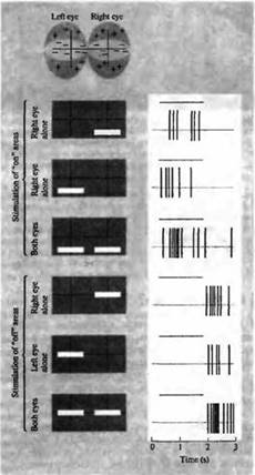 Исследование рецептивных полей клеток, получающих бинокулярную информацию, показывает, что (1) рецептивные поля их обычно находятся в абсолютно эквивалентных частях зрительного поля обоих глаз, (2) они имеют одинаковую предпочтительную ориентацию и (3) соответствующие зоны рецептивных полей дополняют эффекты друг друга. Синергичное действие двух глаз на примере простой клетки показано на рис. 2. Освещение "of"-зоны левого глаза суммируется с освещением "of"-зоны правого глаза. Одновременное освещение в антагонистических зонах обоих глаз уменьшает текущую активность и усиливает "off"-разряды. Подобные клетки отвечают сигналами на одинаковые изображения в обоих глазах.