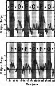 Рис. 3. (Рис. 3А и 3В (срезы зон коры) Зоны коры, ответственные за распознавание лиц, выявленные при функциональном магнитно резонансном исследовании. При этом исследовании пациенту демонстрировались либо изображения лиц, либо другие изображения (например, ложка). При демонстрировании субъекту большего количества изображений лиц (но не других предметов) было зарегистрировано значительное и длительное повышение активности в зоне, расположенной в области веретенообразной борозды (слева на верхней сканограмме). Объекты, не являющиеся лицами, вызывали двустороннюю стимуляцию в областях, расположенных сзади (показано снизу). Усредненные процентные значения изменения сигнала в показанных областях даны справа от сканограмм. Вертикальные темные полоски показывают момент демонстрации пиц (F), или других изображений (0).