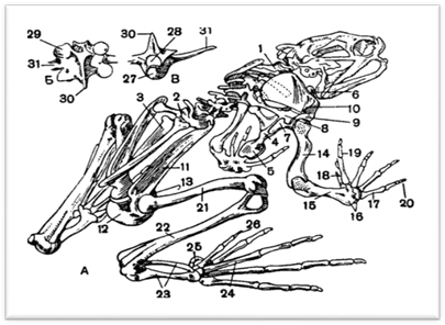 А – цілий скелет; Б – позво нок зверху; В – позво нок зпереду; 1 – шийший позво нок; 2 – кресовий позво нок; 3 – уростіть; 4 – грудина; 5 – хрящова задня частина грудини; 6 – пере грудина; 7 – коракоїд; 8 – прокоракоїд; 9 – лопатка; 10 – надлопаточний хрящ; 11 – подвздошна кістка; 12 – седаліщна кість; 13 – лобковий хрящ; 14 – плечова кість; 15 – передпліччя (лучова та локтева кості); 16 – зап’ястя; 17 – п’ясть; 18 – зачаточний 1 палец; 19 – 2 палец; 20 – 5 палец; 21 – бедро; 22 – голень (велика та мала берцові кості); 23 – передплюсна; 24 – плюсна; 25 – рудимент добав очного пальця; 26 – 1 палец; 27 – піло позвонка; 28 – спинномозговий канал; 29 – сочленовна площадка; 30 – остистий відросток; 31 – поперечний відросток.