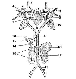 1 – наружна сонна артерія; 2 – внутрішня сонна артерія; 3 – загальна сонна артерія; 4 – легочно-кожна атрерія; 5 – артеріальний конус; 6 – праве предсерддя; 7 – леве предсерддя; 8 – желудочек; 9 – легочна артерія; 10 – легке; 11 – кожна артерія; 12 – печіночні артерії; 13 – желудочна артерія; 14 – кишечка артерія; 15 – спинна аорта; 16 – почечна артерія; 17 – почка; 18 – левий семенник; 19 – подвздошна артерія.