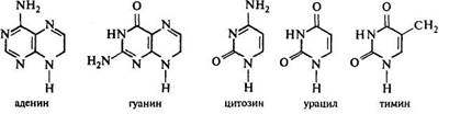 Нуклеиновые кислоты (НК) представляют собой гетерополимеры, мономерами которых являются нуклеотиды. Нуклеотид состоит из азотистого основания, связанного с ним пятиуглеродного сахара и остатка ортофосфорной кислоты (Р). В НК присутствуют азотистые основания двух типов — производные пурина (пуриновые) и производные пиримидина (пиримидиновые). К пуриновым основаниям относятся аденин (А), гуанин (Г), к пиримидиновым — цитозин (Ц), урацил (У) и тимин (Т).