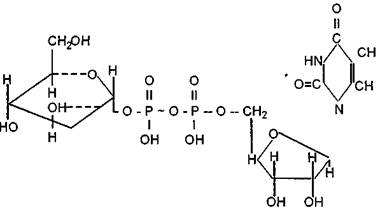 затем глюкозо-6-фосфат изолируется в глюкозо-1-фосфат. Глюкозо-1-фосфат соединяется с УТФ, в результате чегоотщепляется пирофосфатная кислота и образуется соединение глюкозы с уридиндифосфорной кислотой (УДФ) — уридиндифосфатглюкоза.