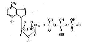 Аденозинтрифосфорная кислота (АТФ) состоит из органического основания аденина (I), углевода рибозы (II) и трех остатков фосфорной кислоты (III). Соединение аденина и рибозы называется аденозином. Пирофосфатные группы имеют макроэргические связи, обозначенные значком ~. Разложение одной молекулы АТФ с участием воды сопровождается отщеплением одной молекулы фосфорной кислоты и выделением свободной энергии, которая равна 33—42 кДж/моль. Все реакции с участием АТФ регулируются ферментными системами.