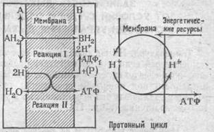 Синтез АТФ происходит таким образом, что два иона Н+ отщепляются от АДФ и фосфата (Р) с правой стороны мембраны, компенсируя потерю двух Н+ при восстановлении вещества В. Один из кислородных атомов фосфата переносится на другую сторону мембраны и, присоединив два иона Н+ из левого отсека, образует Н2 О. Остаток фосфорила присоединяется к АДФ, образуя АТФ.