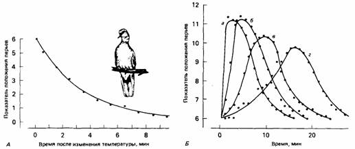| Рис.1. Движение перьев у египетской горлицы при внезапном повышении окружающей температуры и после выпивания 10 см3 холодной воды. Учитывается среднее положение перьев по всей поверхности тела. Кривые а, 6, в, г - реакции на питье с разной скоростью. |