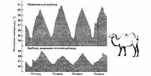 | Рис.2. При обезвоживании температура тела у верблюдов днем повышается, так что им не приходится тратить воду на терморегуляцию. Холодной пустынной ночью верблюд теряет избыток тепла, накопленный днем. |