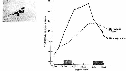 | Рис.3. Ящерица Aporosaura живет на песчаных дюнах, на поверхности которых температура заметно колеблется. При слишком низкой или слишком высокой температуре ящерица зарывается в песок. Обычно это означает один период активности на поверхности утром и еще один - после полудня. Активные периоды обозначены серыми прямоугольниками. |