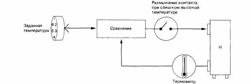 | Рис.4. Принцип обратной связи, действующий в простом термостатическом электpонагревателе. Когда температура достигает заданного уровня, контакт прерывается, нагреватель выключается и температура падает. Koгда она упадет ниже заданного уровня, нагреватель снова включится. |