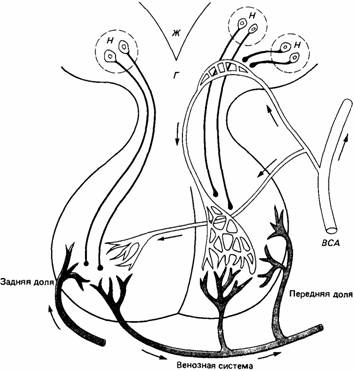 | Рис.6. Схема строения гипофиза человека. Гипоталамус снабжается кровью из внутренних сонных артерий, которые снабжают также переднюю и заднюю доли гипофиза. Нейросекреторные нейроны, тела которых лежат в гипоталамусе, секретируют гормоны в венозную систему. Ж - третий желудочек головного мозга. | ![]() |