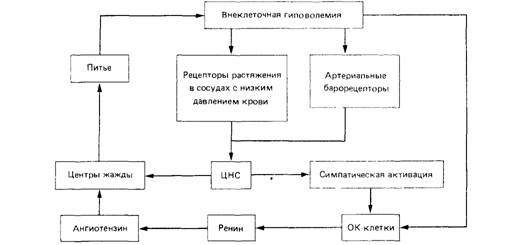 Он поступает в кровь и там стимулирует синтез другого гормона - ангиотензина, который оказывает два основных действия: во-первых, поддерживает нормальное кровяное давление - а следовательно, регулирует кровообращение, - во-вторых, служит мощным возбудителем жажды. Главные компоненты сложных механизмов внеклеточной регуляции жажды показаны на рис.7.