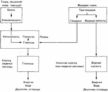 Клетки тела получают энергию также при окислении жирных кислот. Исключение составляют нервные клетки, поскольку они могут использовать только глюкозу. Для того чтобы обеспечить достаточное количество энергии клеткам нервной системы, необходимо, чтобы уровень глюкозы в крови сохранялся примерно на одном уровне. Доступность глюкозы для клеток регулируется гормоном инсулином. Нервные клетки могут поглощать глюкозу и в отсутствие инсулина, но другим клеткам инсулин требуется для транспорта глюкозы через наружную мембрану. При недостатке глюкозы, например при голодании, уровень инсулина в крови падает настолько, что глюкоза становится доступной только нервным клеткам, а другие получают энергию за счет окисления жирных кислот. При воздержании от пищи глюкоза поступает из резервов организма, к которым относятся запасы гликогена в печени и мышцах, запасы жира в разных частях тела и, как последнее средство, белок мышц и других тканей. Жир расщепляется на глицерол и жирные кислоты, а глицерол в печени превращается в глюкозу. Белок расщепляется до аминокислот, из которых также в печени образуется некоторое количество глюкозы. Источники энергии при голодании представлены на рис.9.