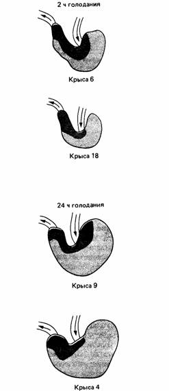 Рис.10. Желудки крыс; видно распределение нищи синего цвета, съеденной после неокрашенной пищи. |